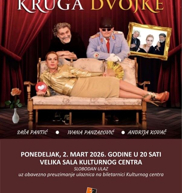 Комедија “Госпођа из круга двојке”, Саше Пантића, аутора текста и редитеља у понедељак, 2. марта 2026. године биће изведена на великој сцени Културног центра у Горњем Милановцу. Шта се може десити када госпођу из круга двојке остави вереник? Желећи да му се освети, она објављује оглас да тражи мужа… Смех, хаос и добра забава су […]