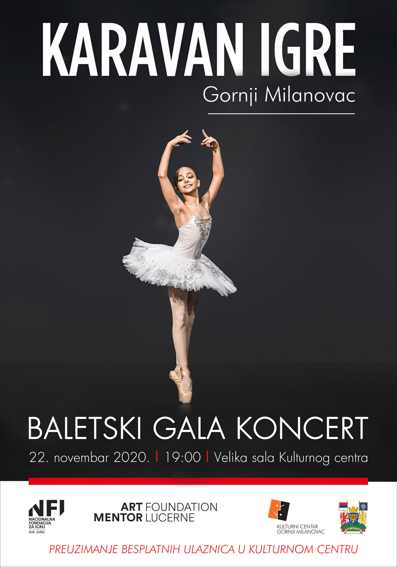 U okviru proijekta “Karavan igre” čiji je cilj da kroz umetničke, kreativne, a pre svega interaktivne programe promoviše umetničku igru u nedelju, 22. novembra 2020. godine u velikoj sali Doma kulture u Gornjem Milanovcu biće organizovan baletski gala koncert.