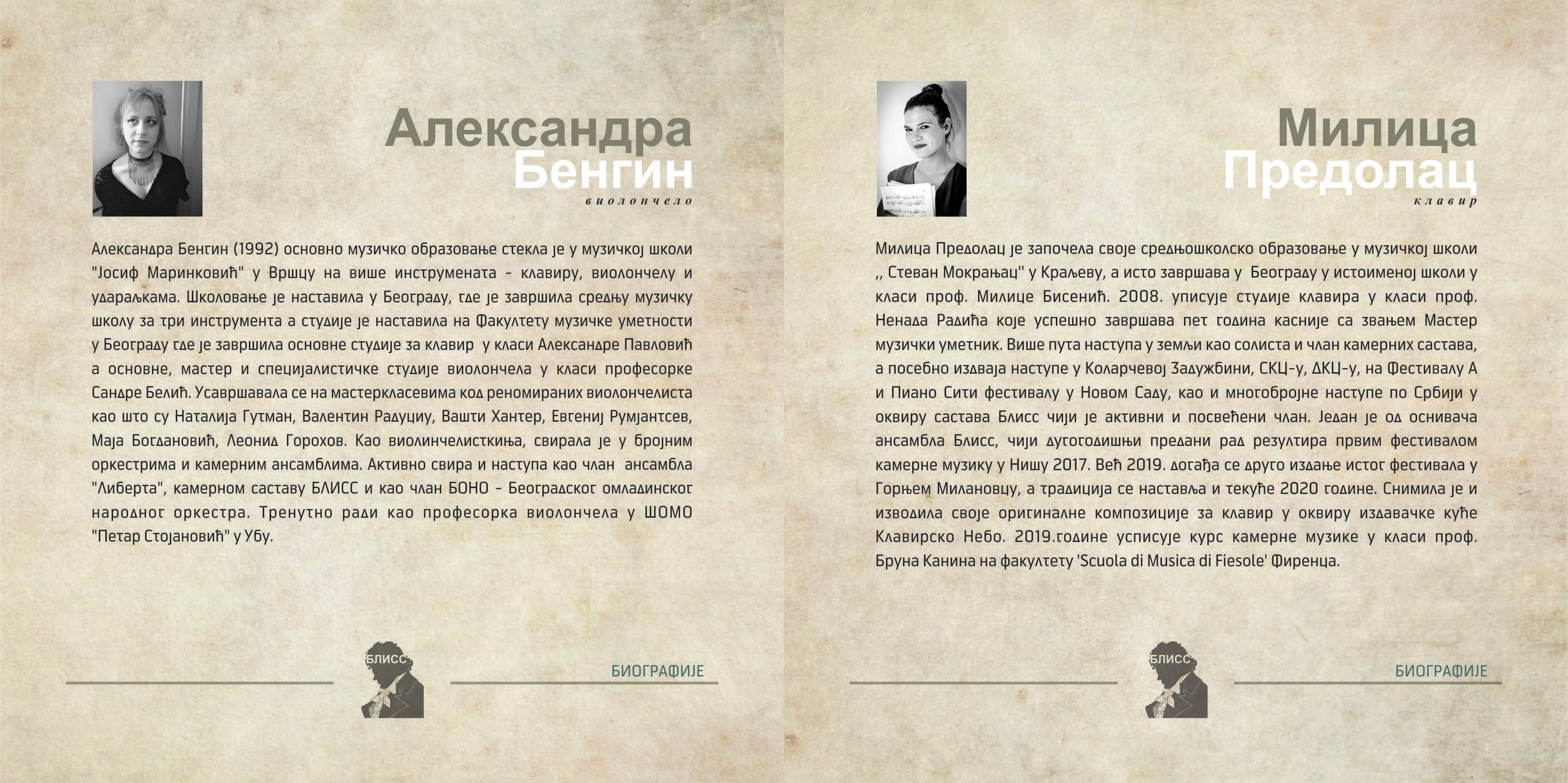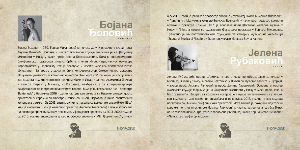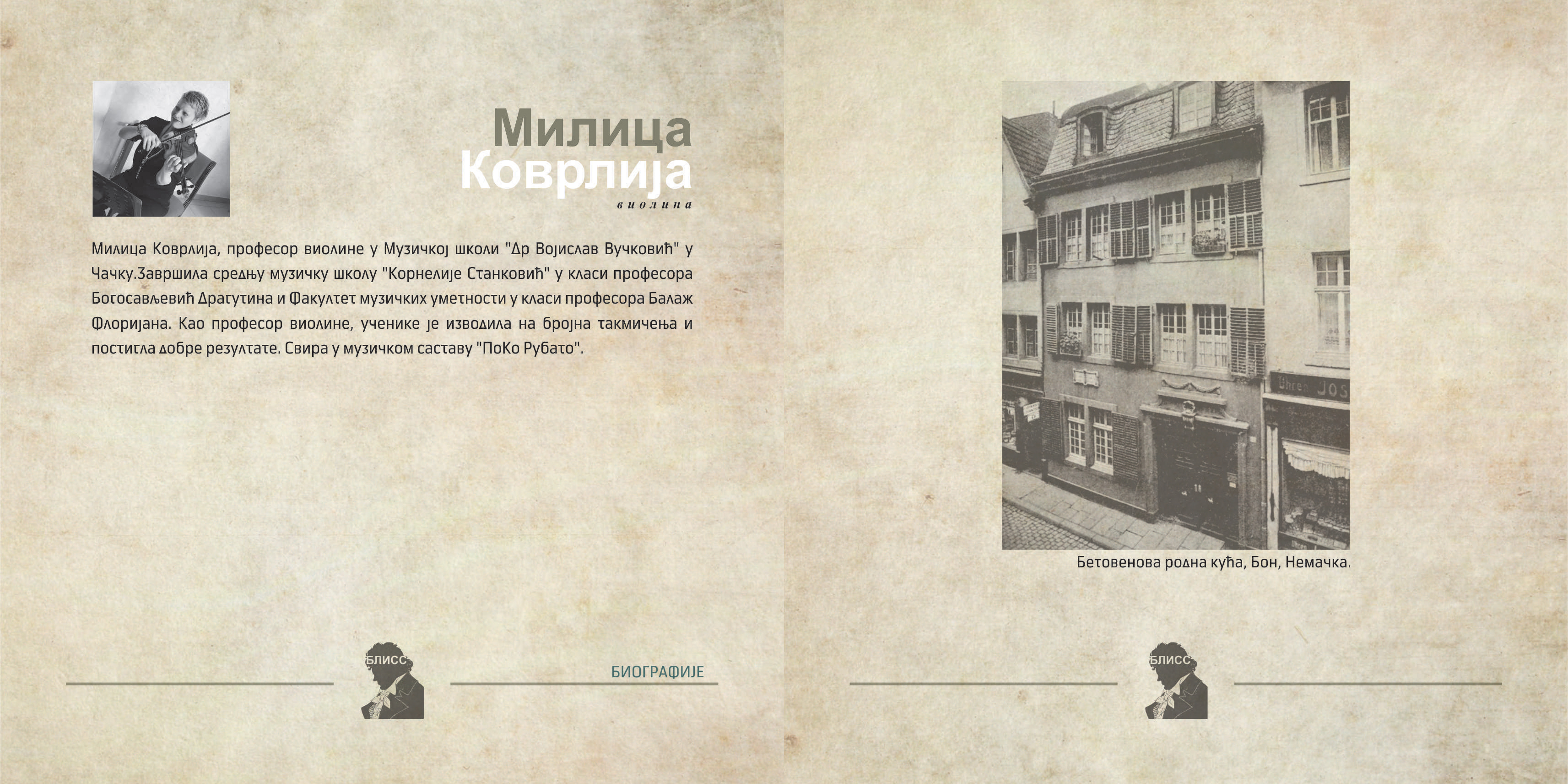 Povodom 250 godina od rođenja Ludviga van Betovena, jednog od najvećih kompozitora svih vremena, Ansambl “BLISS” u sastavu: Bojana Đolović – violina, Milica Predolac – klavir, Jelena Rubaković – viola, Milica Kovrlija – violina i Aleksandra Bengin – violončelo, minule sedmice (17. i 18. decembar 2020. godine)u holu velike sale Kulturnog centra u Gornjem Milanovcu održao je koncert u okviru Trećeg festivala kamerne muzike.
